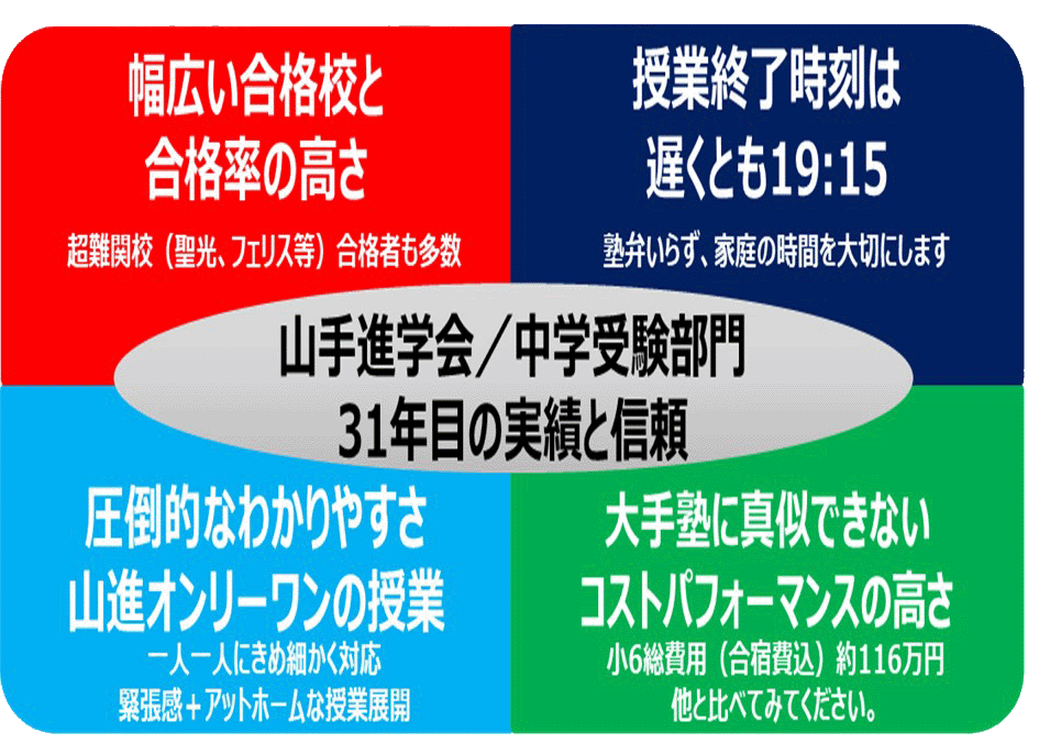 | 授業日程 月曜日 17:00~19:15 算数【共通】 火曜日 17:00~19:15 国語 水曜日 16:10~19:15 理科・社会 木曜日 17:00~19:15 算数【基本】 金曜日 17:00~19:15 算数【応用】 日曜日 13:00~16:30 週例テスト |